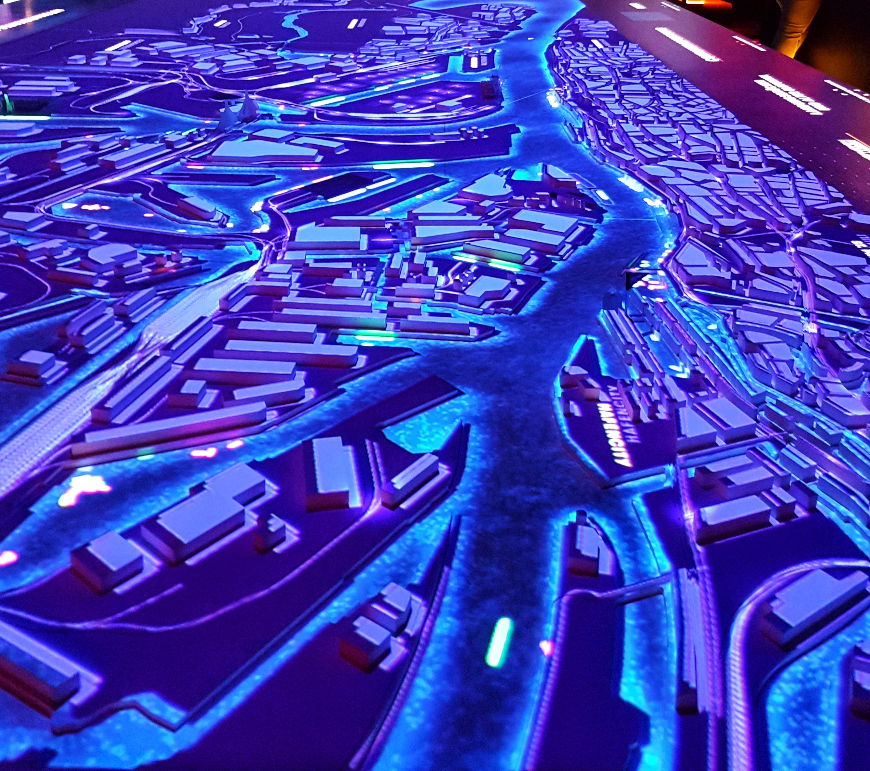 Interaktiver Hafenplan im Discovery Dock - zudem gibt es viele Videos, und man kann sich mit Hilfe von VR-Brillen in einem Trockendock Elbe 17 umschauen und einen Container direkt von einer Containerbrücke aus entladen |